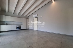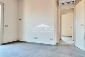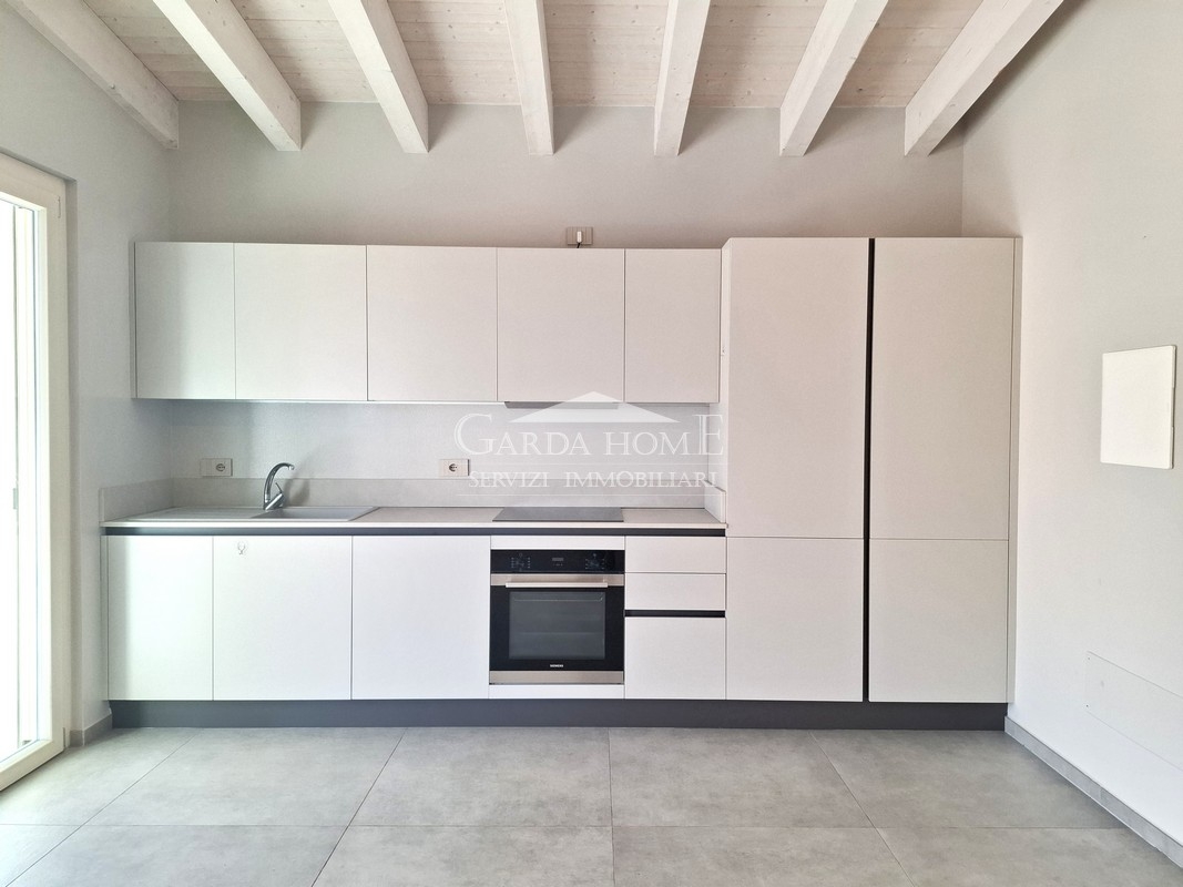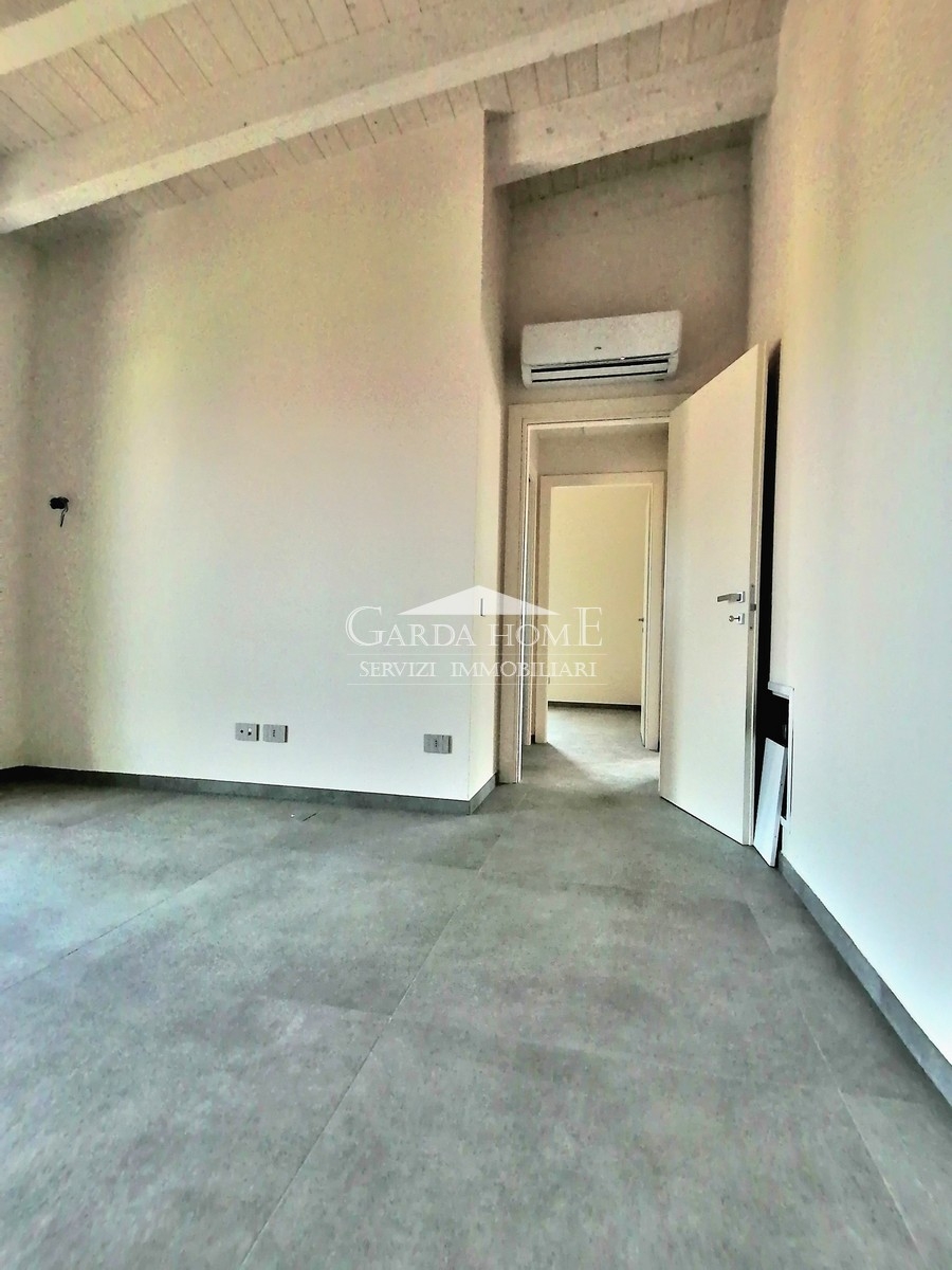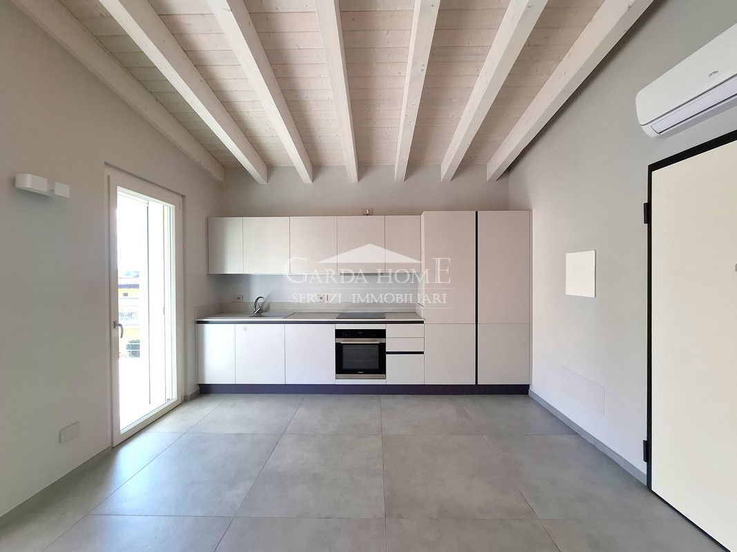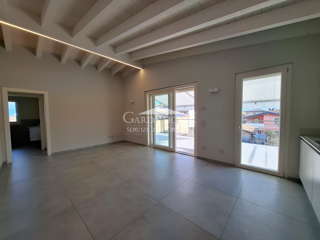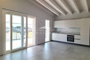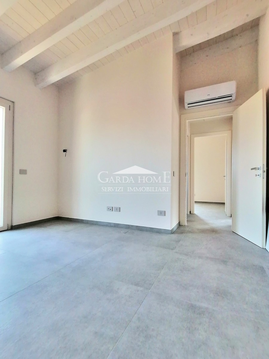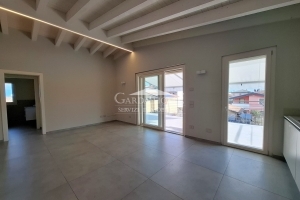 Ampio e luminoso appartamento inserito in una palazzina di nuova costruzione, ubicata nel centro di Rivoltella. E' situato al piano secondo ed ultimo ed è servito da ascensore. E' composto da una zona living con cucina a vista ed ampia vetrata che conduce alla spaziosa terrazza soleggiata, un disimpegno, due camere da letto ed un bagno dotato di finestra. L'abitazione presenta delle eccellenti finiture, pavimenti in gres porcellanato, soffitti alti con travi in legno a vista sbiancate, serramenti ed impianti di ultima generazione. Dispone infatti di tutti gli accorgimenti tecnici per il risparmio energetico quali sistema di riscaldamento a pavimento con pompa di calore coadiuvata dall'impianto fotovoltaico, impianto di raffrescamento con split, serramenti a taglio termico dotati di zanzariere, cappotto esterno e tapparelle elettriche, predisposizione impianto di allarme e predisposizione aspirazione centralizzata delle polveri. Completa la proprietà un garage triplo dotato di basculante sezionale elettrica al piano interrato. L'immobile viene locato con la cucina completa di elettrodomestici ed arredo bagno. Le spese condominiali ammontano a circa Euro 100,00 mensili, salvo conguaglio. Viene stipulato un contratto 4+4. Sono richieste referenze lavorative dimostrabili.