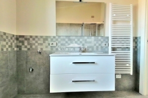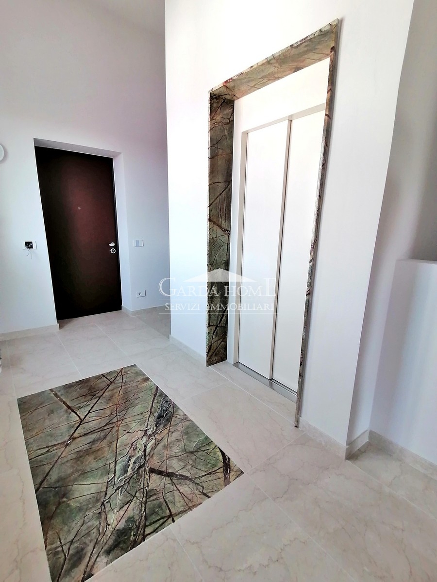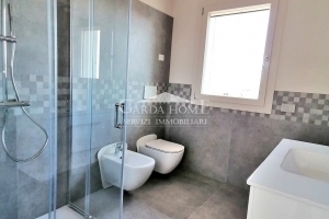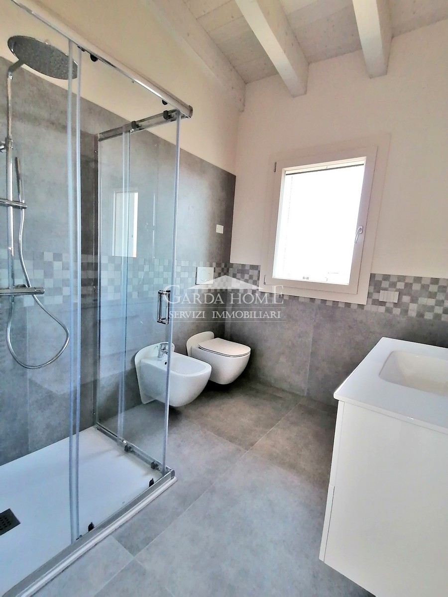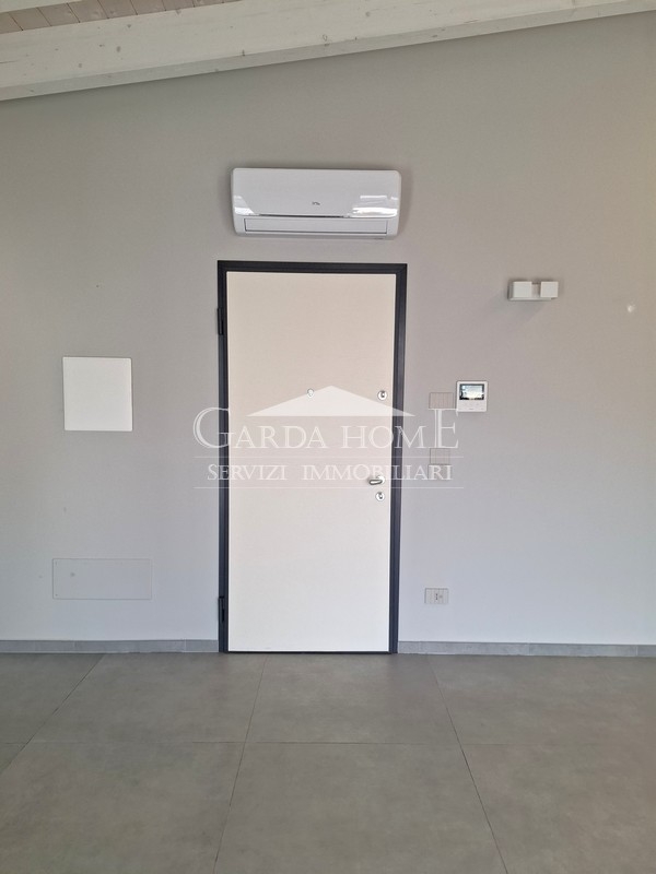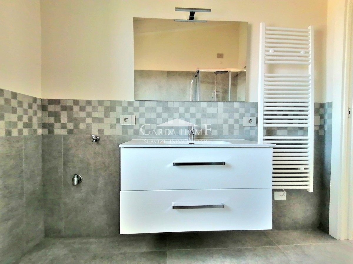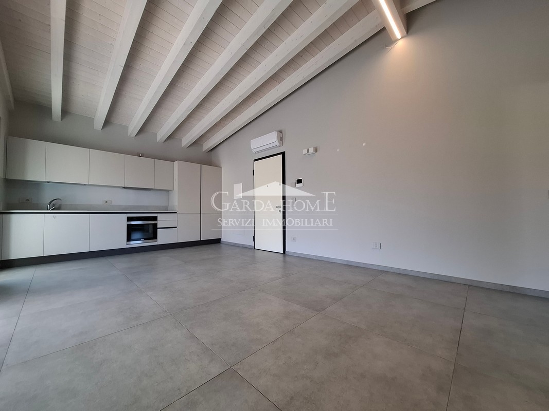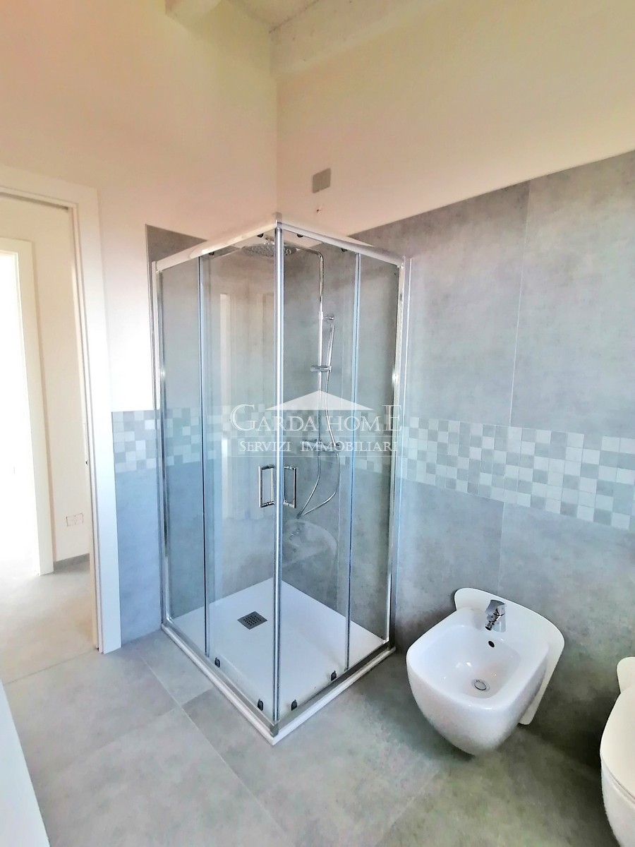 Ampio e luminoso appartamento inserito in una palazzina di nuova costruzione, ubicata nel centro di Rivoltella. E' situato al piano secondo ed ultimo ed è servito da ascensore. E' composto da una zona living con cucina a vista ed ampia vetrata che conduce alla spaziosa terrazza soleggiata, un disimpegno, due camere da letto ed un bagno dotato di finestra. L'abitazione presenta delle eccellenti finiture, pavimenti in gres porcellanato, soffitti alti con travi in legno a vista sbiancate, serramenti ed impianti di ultima generazione. Dispone infatti di tutti gli accorgimenti tecnici per il risparmio energetico quali sistema di riscaldamento a pavimento con pompa di calore coadiuvata dall'impianto fotovoltaico, impianto di raffrescamento con split, serramenti a taglio termico dotati di zanzariere, cappotto esterno e tapparelle elettriche, predisposizione impianto di allarme e predisposizione aspirazione centralizzata delle polveri. Completa la proprietà un garage triplo dotato di basculante sezionale elettrica al piano interrato. L'immobile viene locato con la cucina completa di elettrodomestici ed arredo bagno. Le spese condominiali ammontano a circa Euro 100,00 mensili, salvo conguaglio. Viene stipulato un contratto 4+4. Sono richieste referenze lavorative dimostrabili.