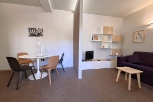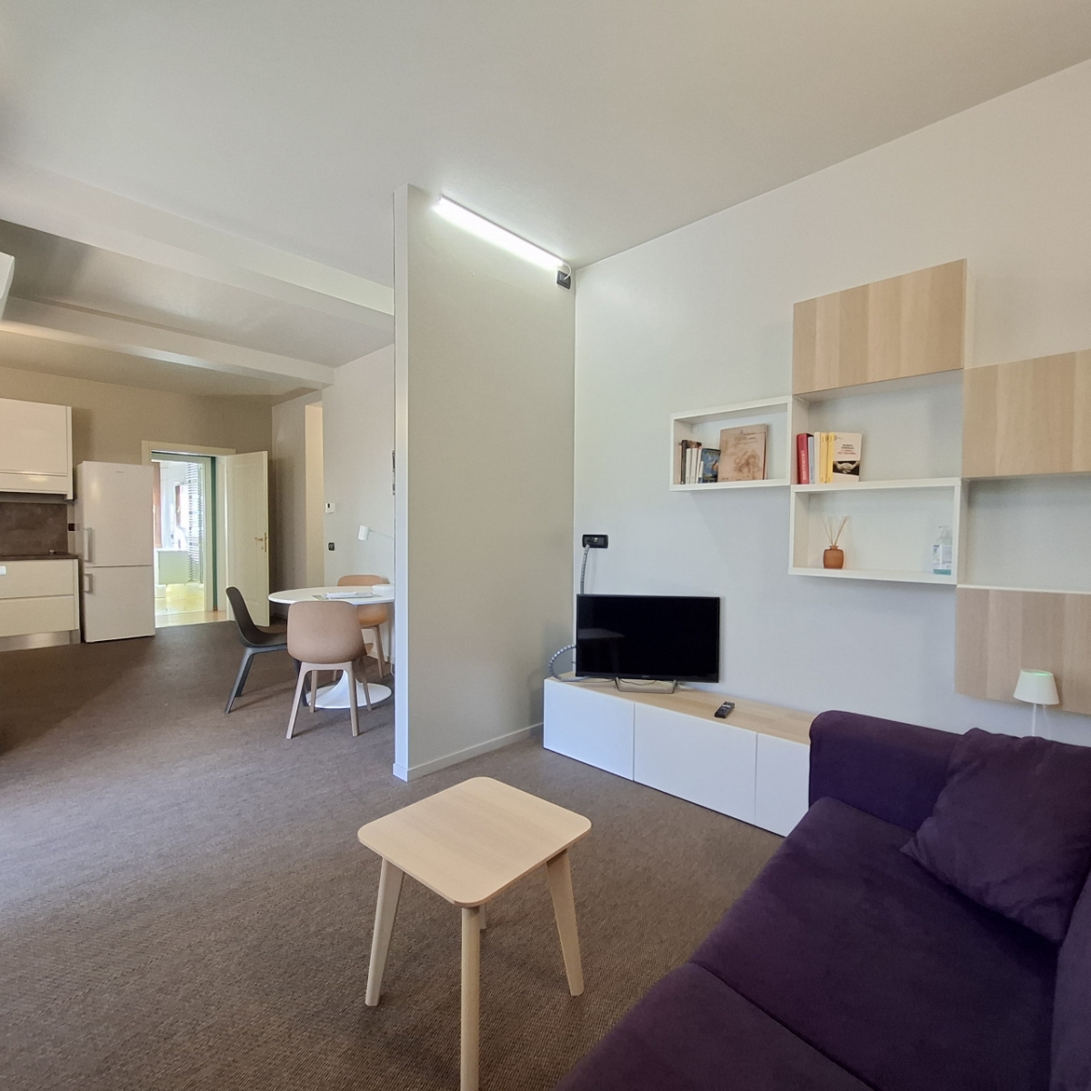 L'area living open space presenta una moderna cucina a vista completamente attrezzata con elettrodomestici inclusi forno e lavastoviglie; adiacente troviamo l'accogliente zona pranzo e il salotto luminoso. Un bagno di servizio funzionale completa questa area conviviale.