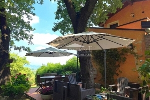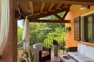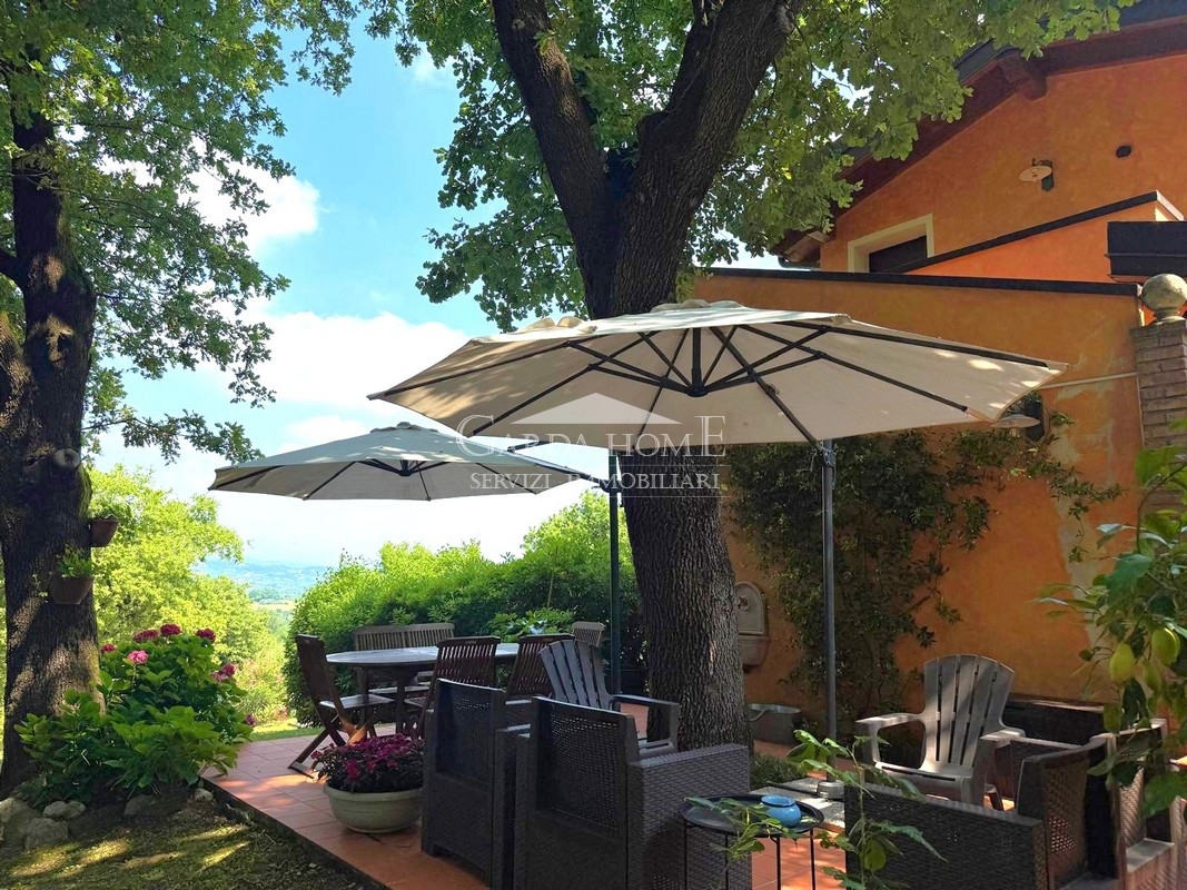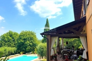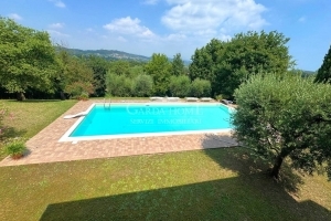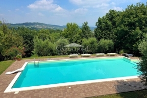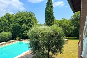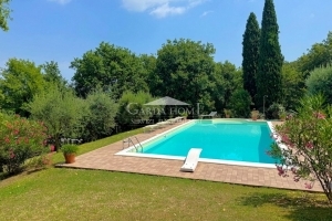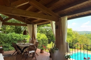 La proprietà vanta finiture ricercate come pavimenti in cotto, caminetti tradizionali, cucina dallo stile shabby chic e travi a vista decapate. Gli ampi porticati affacciati sulla piscina privata offrono spazi ideali per momenti conviviali all’aperto o rilassanti pomeriggi nel verde; il terrazzo coperto regala una suggestiva vista panoramica sulle colline circostanti.